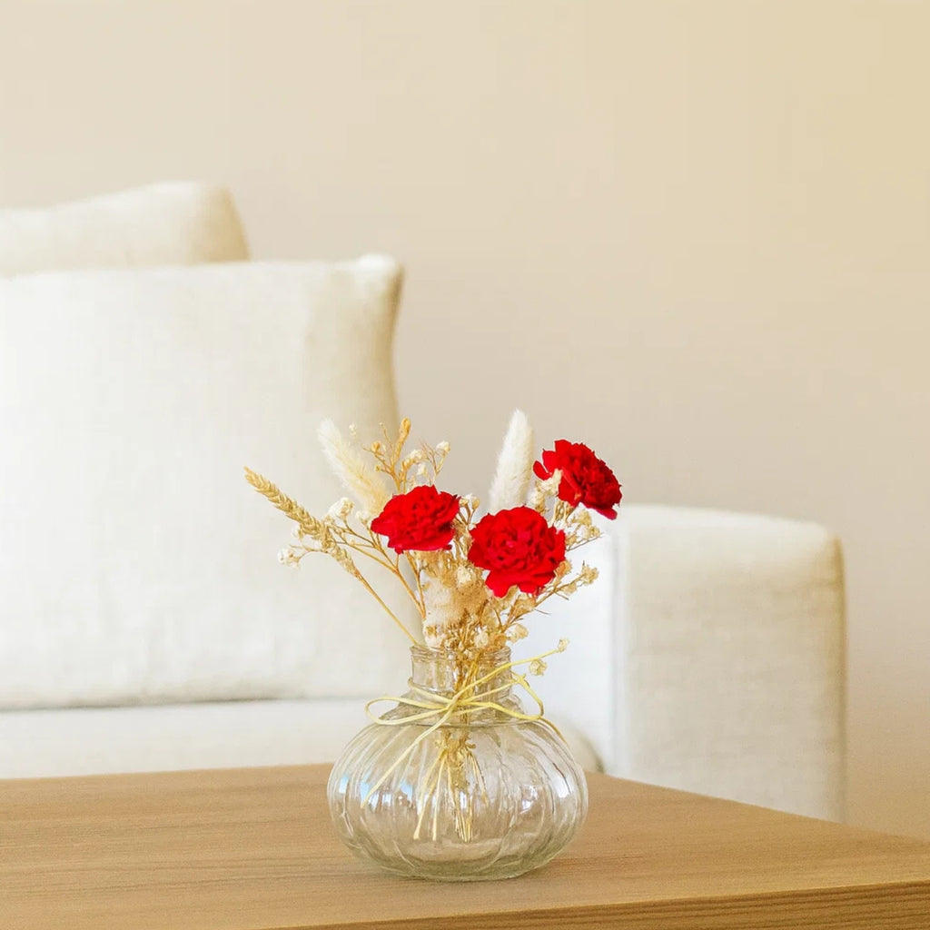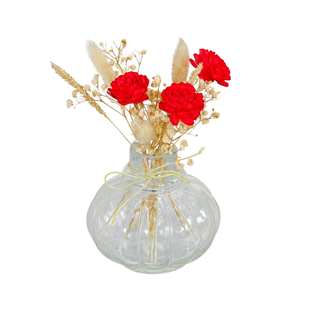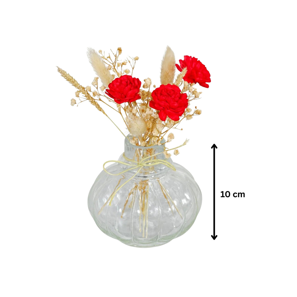 Elevate your decor with this delightful Mini Glass Bottle Vase paired with a striking red velvet floral bunch. The transparent ribbed glass design adds a touch of vintage elegance, while the bold red blooms bring life and color to any setting. Perfect for desks, bedside tables, or gift hampers, this piece blends simplicity with eye-catching charm.