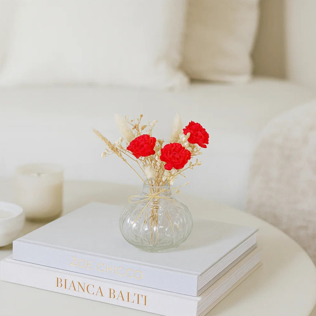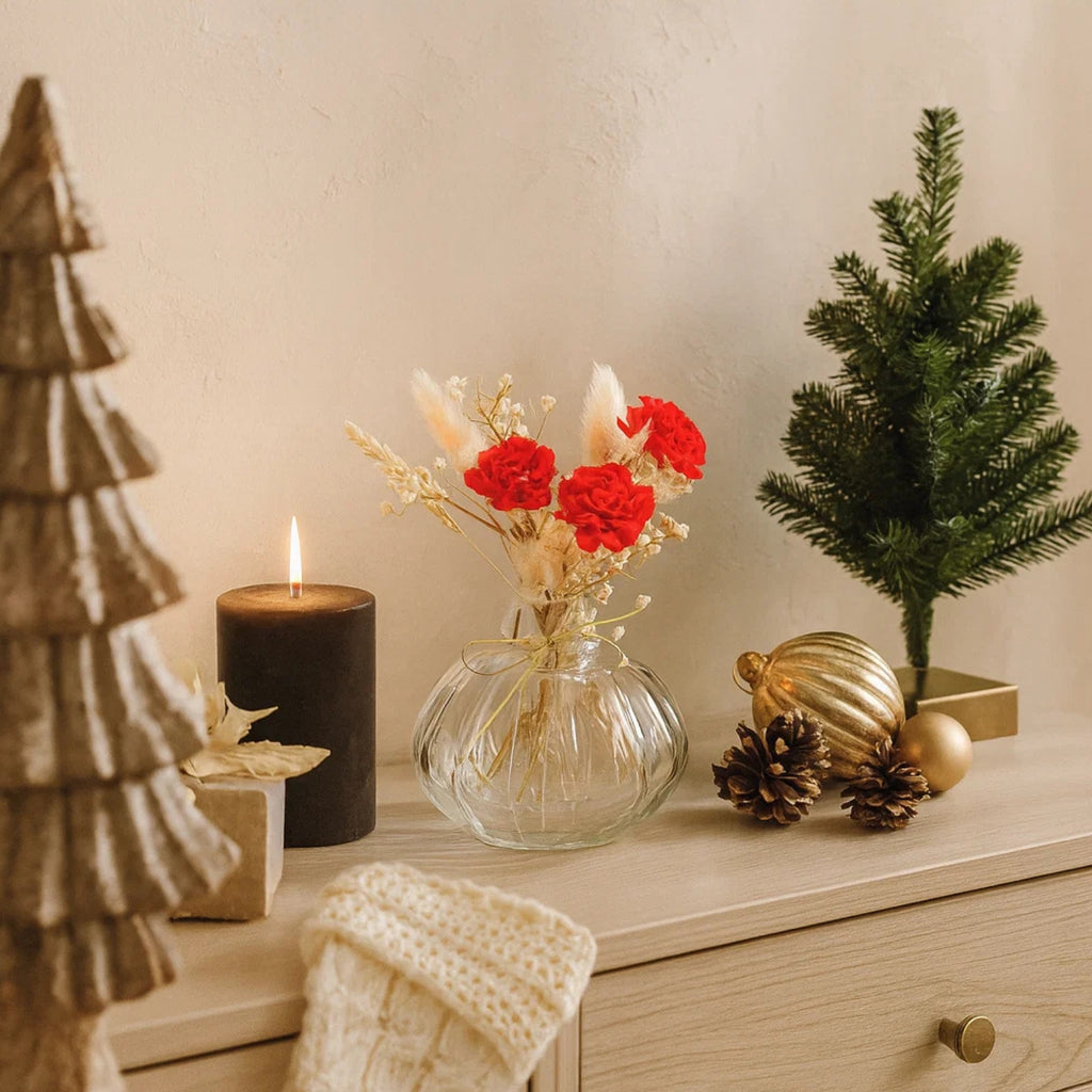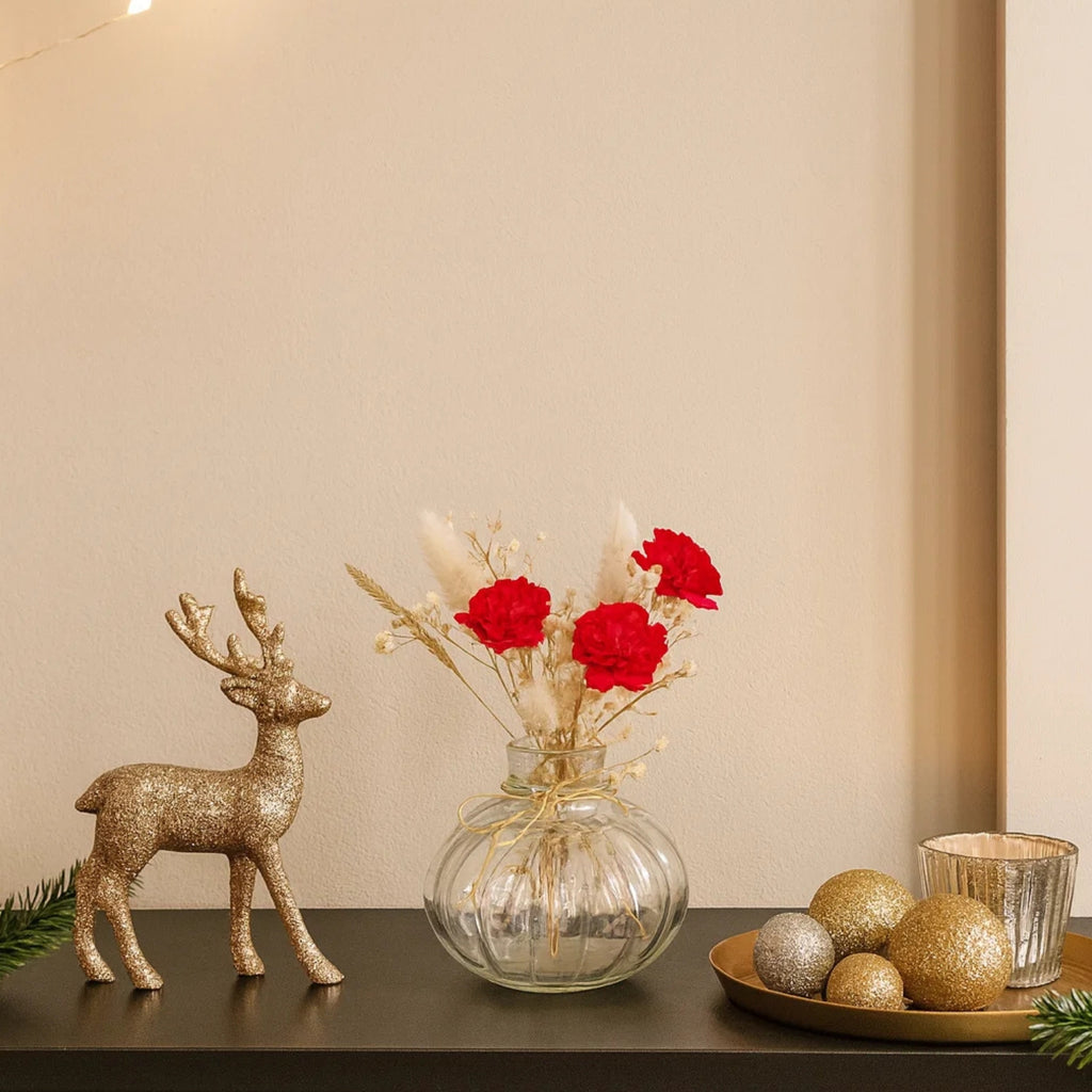 Elevate your decor with this delightful Mini Glass Bottle Vase paired with a striking red velvet floral bunch. The transparent ribbed glass design adds a touch of vintage elegance, while the bold red blooms bring life and color to any setting. Perfect for desks, bedside tables, or gift hampers, this piece blends simplicity with eye-catching charm.
