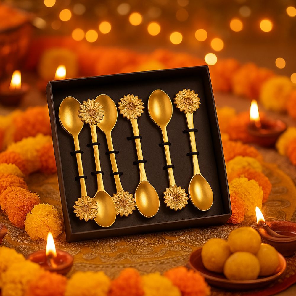 Classic Brass Cutlery Set With Floral Handles - Set of 6