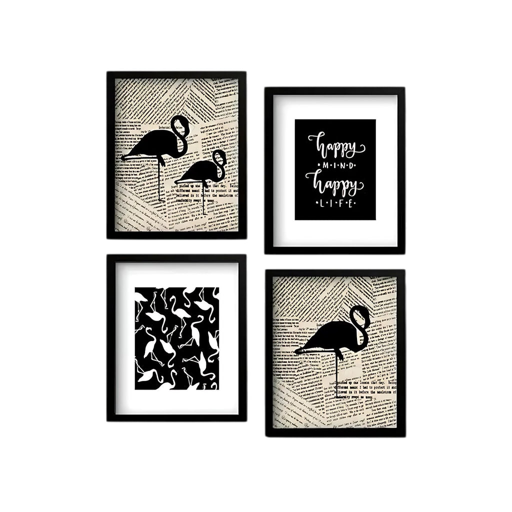 Design: Artistic reprint featuring black flamingos, abstract motifs, and a “Happy Mind Happy Life” quote.
