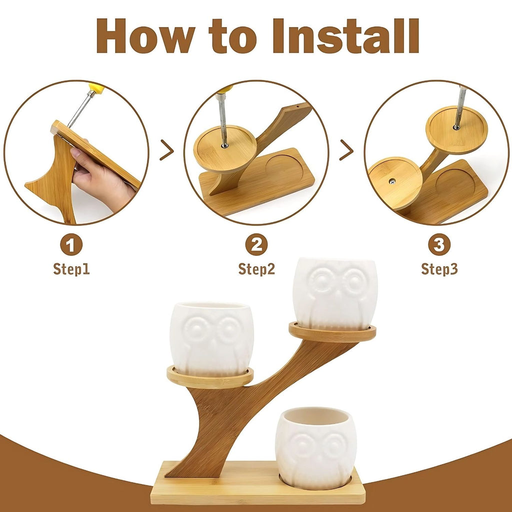 Elegant Multi-Tier Bamboo Plant Stand With 3 Ceramic Owl Planters
