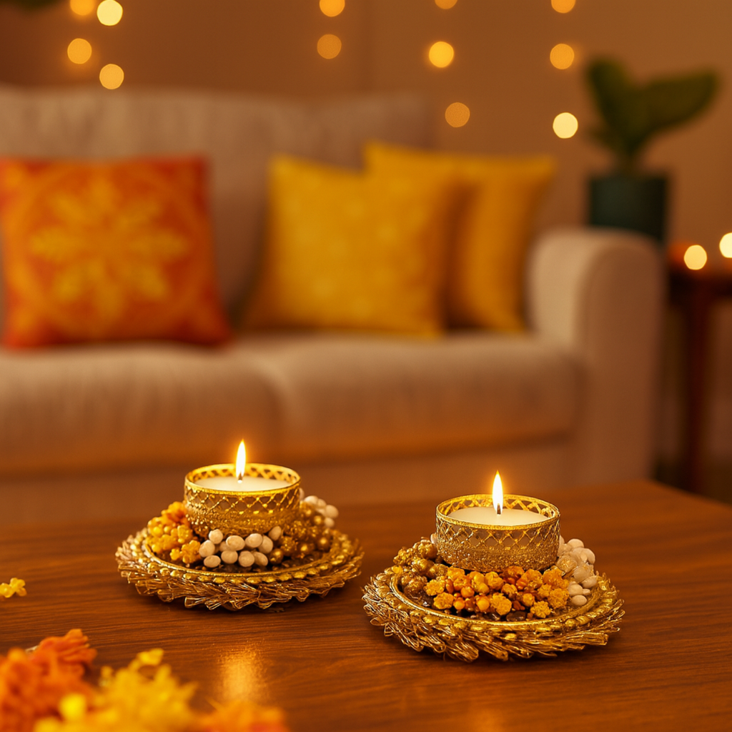 Golden Tealight Candle Holders with Yellow & White Beads – Set of 2 | Elegant Decorative Diyas for Diwali & Home Décor
