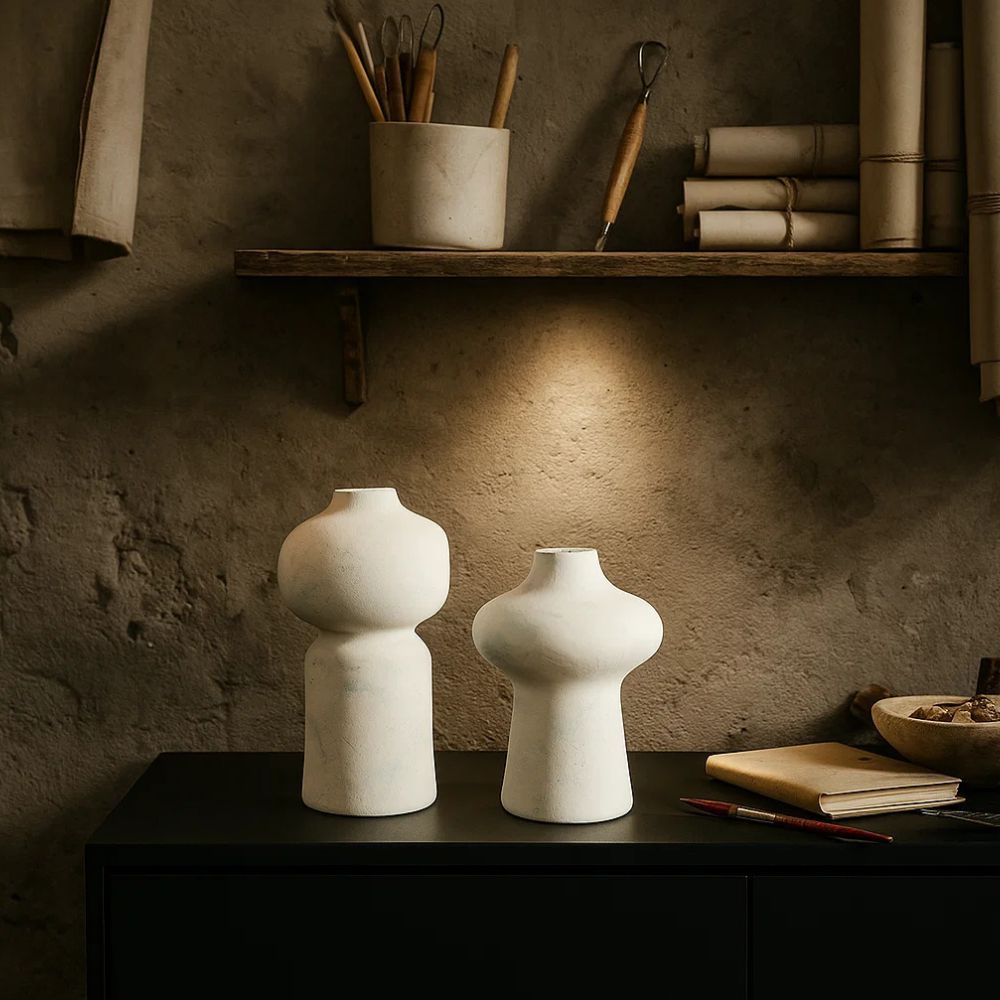 Set of Two Vases: Includes two uniquely shaped ceramic vases for versatile styling.
