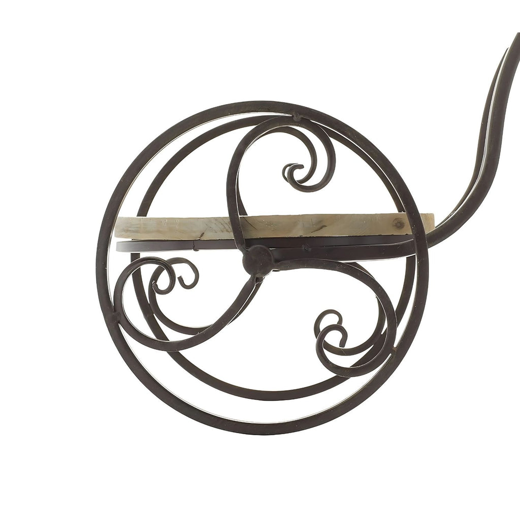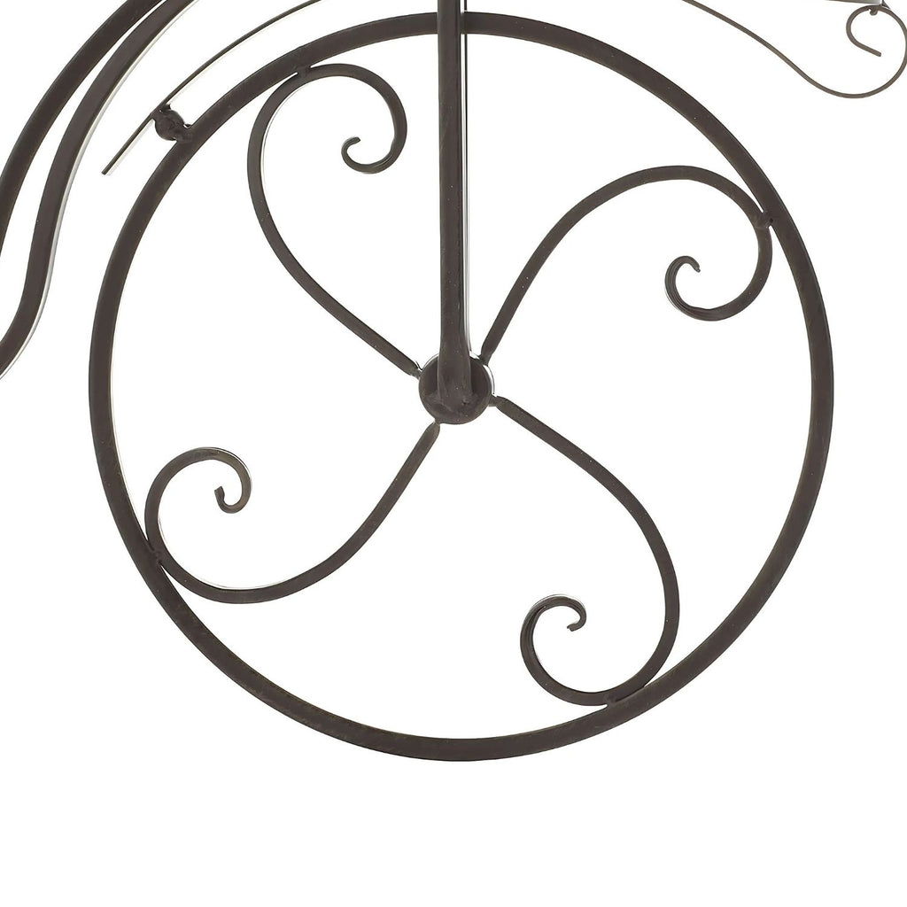 Add a whimsical and charming touch to your home or garden decor with this vintage-inspired bicycle-style metal plant stand. Featuring a beautifully curved wrought iron frame with wooden platforms, it offers two tiers for displaying your favorite plants, flowers or decorative pieces. The artistic design makes it an eye-catching statement piece while its sturdy construction ensures reliable use both indoors and outdoors.